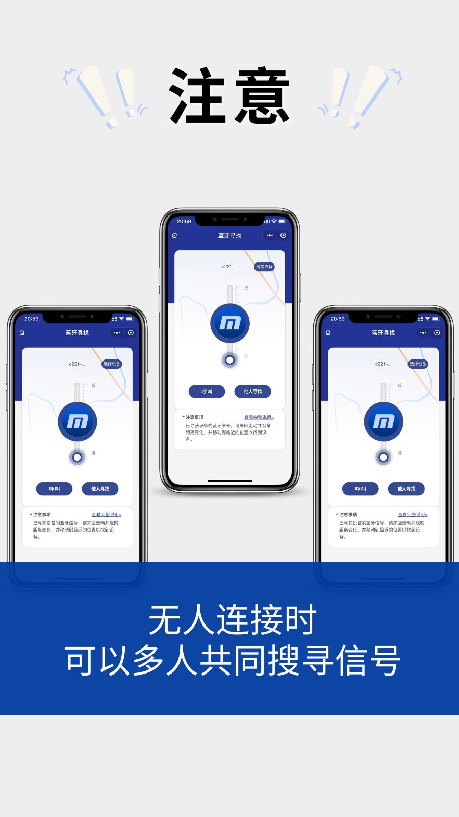 如果多人寻找,一人在呼叫时,其他人是无法寻获信号的,因为蓝牙设备只支持一个连接。如果没有人连接到设备,则所有人都可以寻获信号。