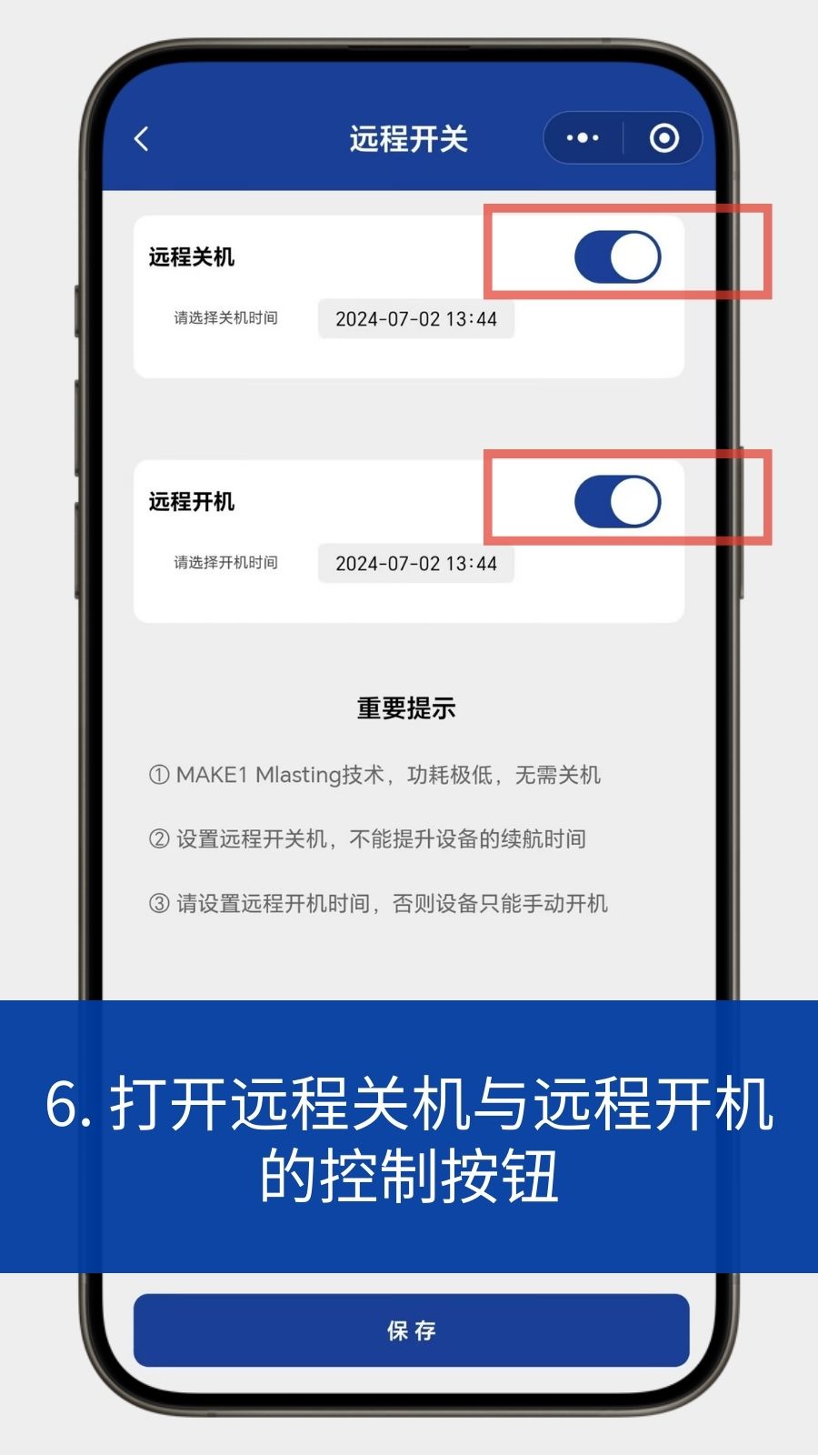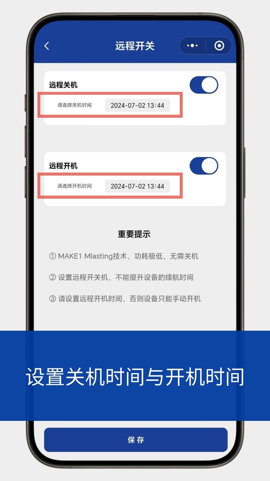 MAKE1GPS支持远程开关机功能,在长时间不使用设备情况可设置定时开关机功能。