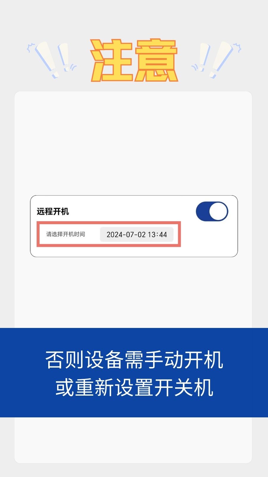 2.请设置开机时间,否则设备需手动开机或重新设置开关机,重新开机会有一定延迟,请耐心等待。